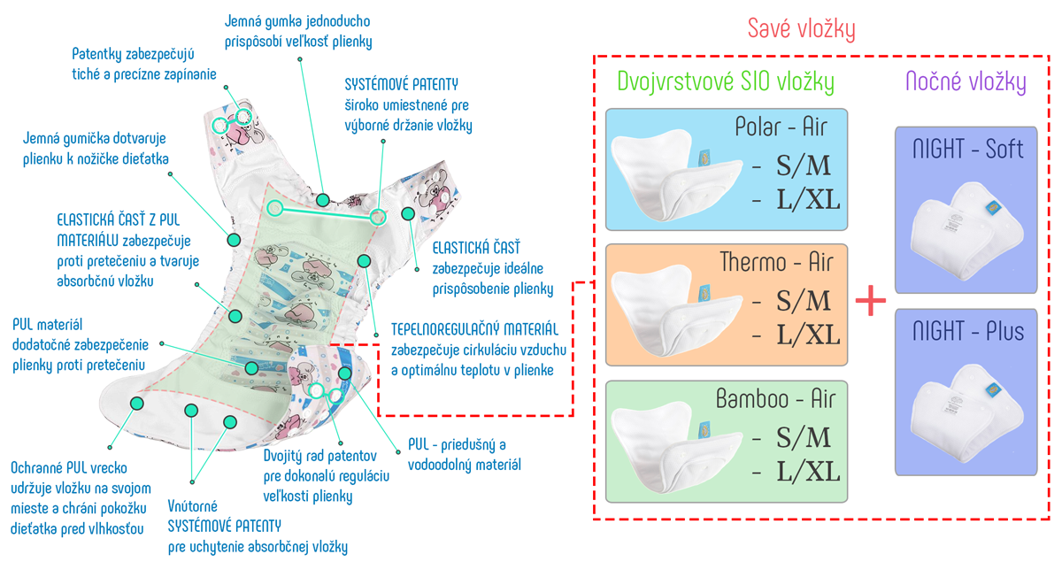 Na výber k SIO/SYSTÉM plienke je možné použiť niekoľko typov dvojvrstvových savých vložiek, a to na základe citlivosti pokožky vášho dieťatka. Výber savej vložky je na vás, pretože v rôznych obdobiach sa môže citlivosť pokožky meniť, napr. v lete nemusí dieťatko znášať materiál, ktorý mu vyhovoval v zime.
